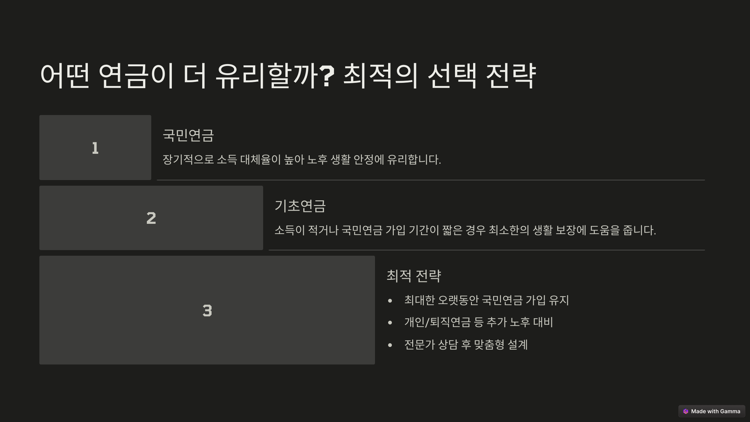 국민연금과 기초연금 중 어떤 것이 더 유리할지는 개인의 상황에 따라 달라요. 연금 전략을 잘 세우면 노후에 더 많은 혜택을 받을 수 있습니다. 😊