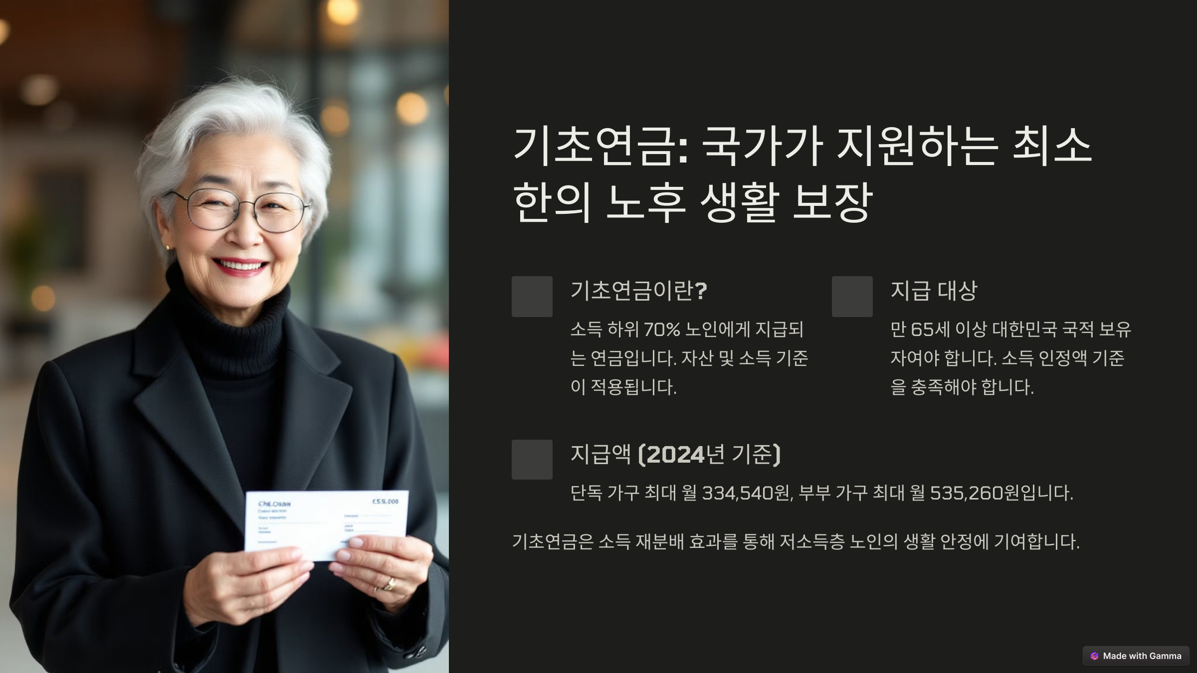 📢 기초연금은 정부에서 지급하는 복지 연금으로, 일정 소득 이하인 노인이 받을 수 있어요.