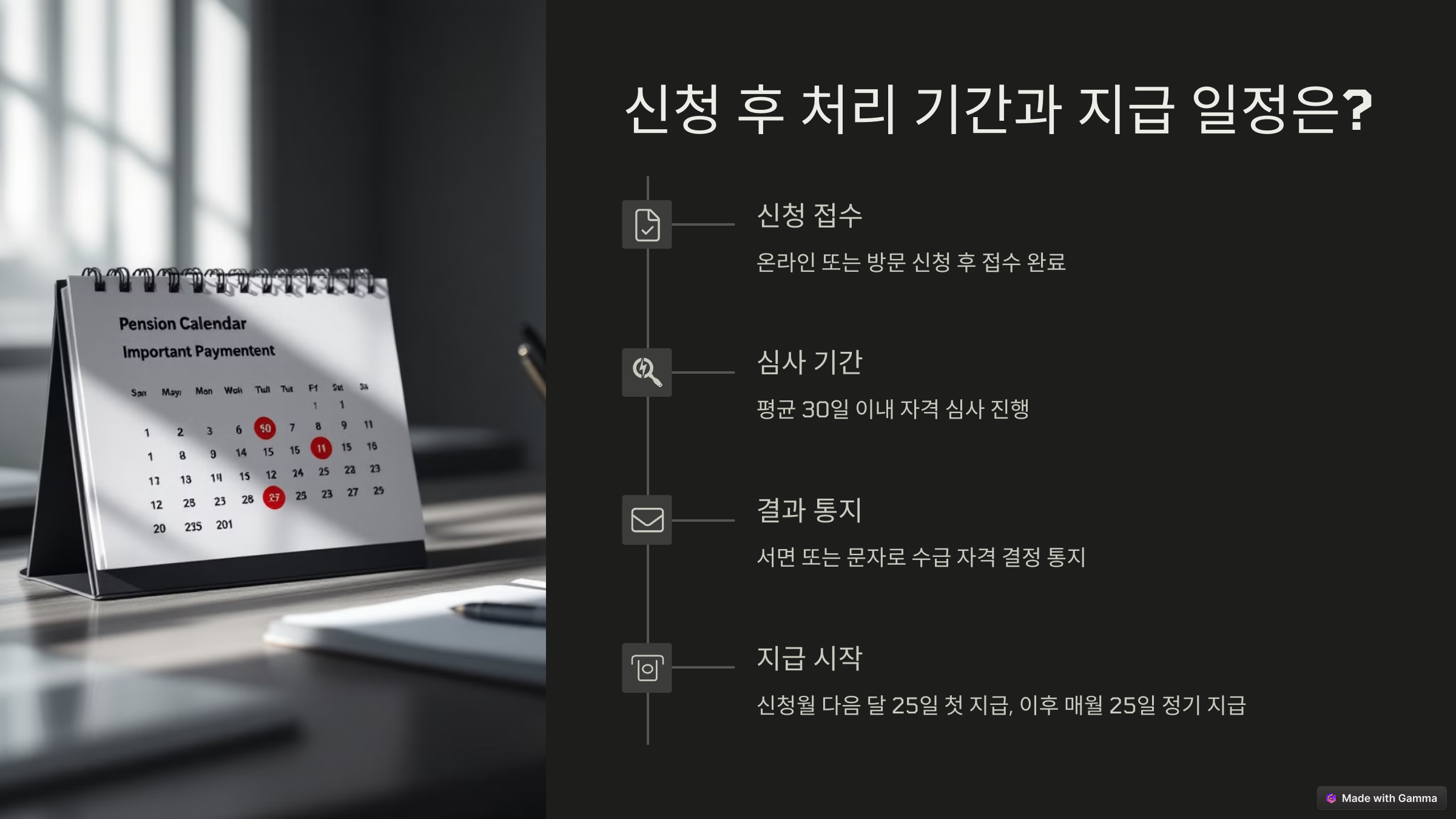 | 연금 지급 | 신청 후 2~3개월 | 매월 25일 지급 |