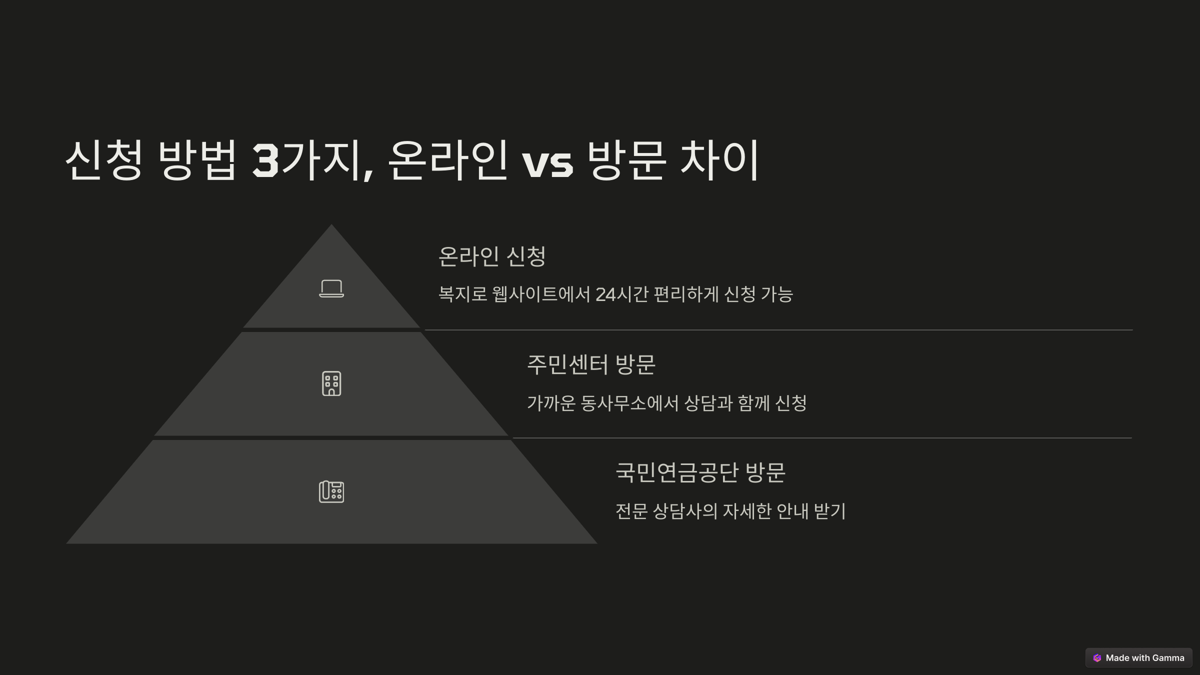 | 방문 신청 | 읍·면·동 주민센터 또는 국민연금공단 방문 → 신청서 제출 | 대리 신청 가능 |